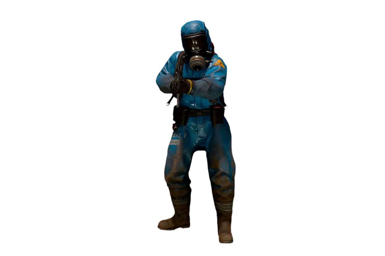 Scientists - blue hazmat suits, masks, automatic weapons